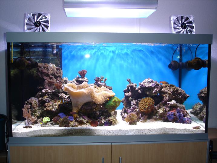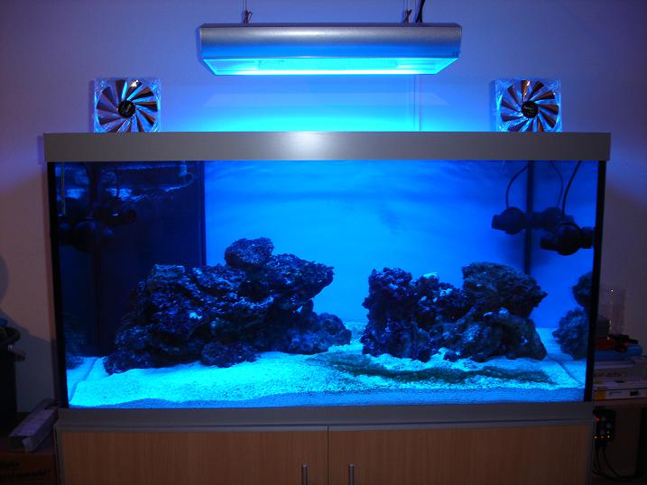 Bonsoir a tous voici la suite de l'aventure de mon bac cela fait maintenant 3 semaines qui tourne les algues arrivent on va bientôt pouvoir tondre la pelouse :D J'ai posé des ventilos de PC transparents avec hélice chromée le tout couplés a un thermostat pour réguler la température quand la température de l'eau monteras trop haut le ventilos se mettront en route pour refroidir le bac voila mon installe arrive au bout reste quelques petites mise en place avec le cablage et j'espère bientôt pouvoir peupler mon bac.