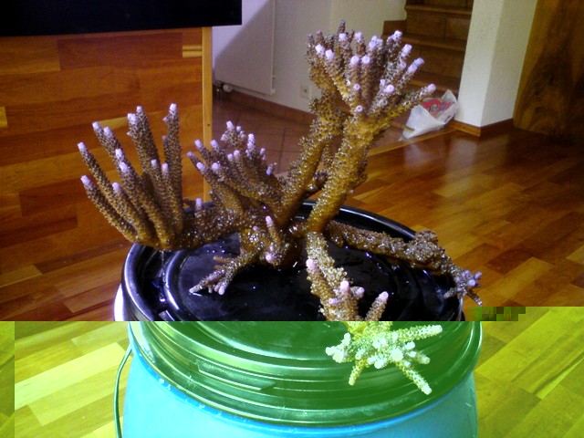 Aujourd'hui petit souci en triant les boutures destinée au nouveau bac de Philippe, j'ai à peine touché un Acropora branchu qu'il s'est décollé de la pierre ou il était fixé. Et pour compliquer un peux plus la chose, j'avais dans la main une bouture et appuyer contre mon poignet l'Acro qui vu ça taille aurait pu faire pas mal de dégât en tombant...