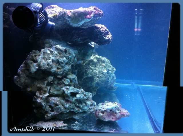 Cette disposition, outre le fait d'oofrir plus d'espace possible pour les coraux offre ausi une belle place dessous la pierre qui est devant et de nombreuses cachettes pour les futurs hôtes.