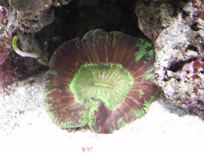 Voilà quelques ch'tites photos. J'ai eus quelques ennuis de cyano durant les mois oct-nov, j'avais la nette impression que la bac allais foirer, mais c'est revenu à la normale :wink: J'ai également eus récemment un dépérissement soudain de mes digitata :cry: bizarrement la morphe verte n'a pas été atteinte, mais j'ai du scalper le "violet" (plutot brun chez moi :lol: ) et l'orange. Seul le "pied" du corail avait encore des polypes, j'espère qu'ils vont se retaper :wink: . Les plateaux grandissent biens et le M. danae n'a heureusement pas subit de dégats :D