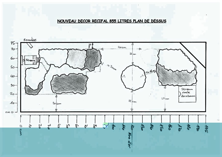 Puis plan vu de dessus avec déplacement de la colonne sur la droite à cause de mes réflecteurs Lumenbright qui sont assez directionnels. Je prend aussi en compte le masquage de mes streams 6100 à gauche à la mode Stanley avec un tuyau traversant les PV et à droite dans une streamrock de Tunze. Ces plans mâideront à monter le décor avec quelques mesures de références. Bien entendu, il faudra un peu adapter le moment venu selon les PV. Pour cela, je vais prendre un box de PV de réserve pour avoir du choix et également par cela, refournir des nouvelles pierres dans mon bac et enlever celles qui sont colonisées par des discosomas ou xenia sur l'arrière.