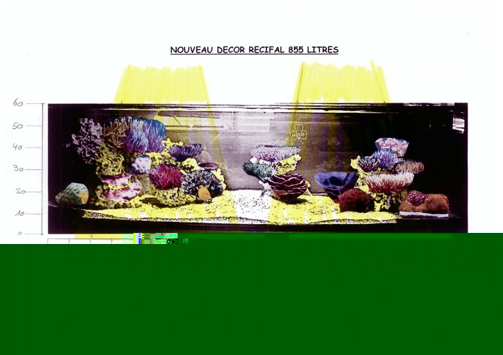 J'ai déjà fait quelques plans pour me faire une idée de ce que cela pourrait donner. Tout est à l'échelle, que cela soit le bac, les massifs ou les coraux selon leur grandeur en début décembre.