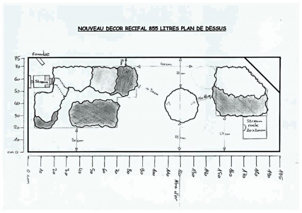 Puis plan vu de dessus avec déplacement de la colonne sur la droite à cause de mes réflecteurs Lumenbright qui sont assez directionnels. Je prend aussi en compte le masquage de mes streams 6100 à gauche à la mode Stanley avec un tuyau traversant les PV et à droite dans une streamrock de Tunze. Ces plans mâideront à monter le décor avec quelques mesures de références. Bien entendu, il faudra un peu adapter le moment venu selon les PV. Pour cela, je vais prendre un box de PV de réserve pour avoir du choix et également par cela, refournir des nouvelles pierres dans mon bac et enlever celles qui sont colonisées par des discosomas ou xenia sur l'arrière.
