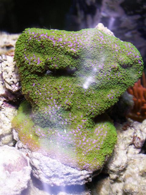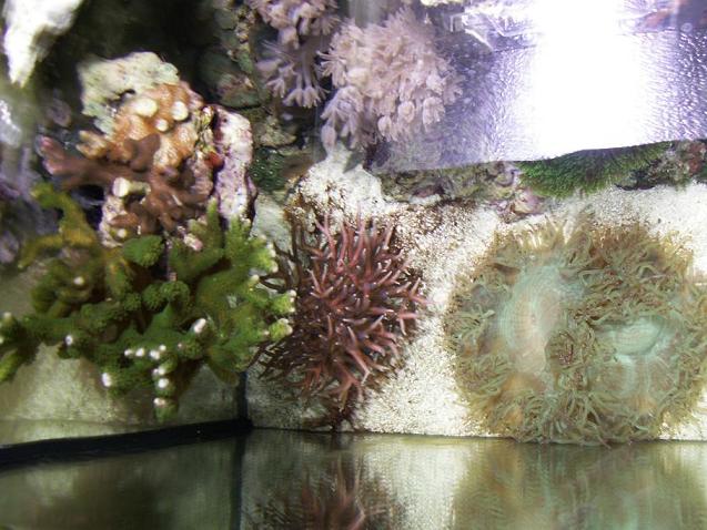 Voilà quelques ch'tites photos. J'ai eus quelques ennuis de cyano durant les mois oct-nov, j'avais la nette impression que la bac allais foirer, mais c'est revenu à la normale :wink: J'ai également eus récemment un dépérissement soudain de mes digitata :cry: bizarrement la morphe verte n'a pas été atteinte, mais j'ai du scalper le "violet" (plutot brun chez moi :lol: ) et l'orange. Seul le "pied" du corail avait encore des polypes, j'espère qu'ils vont se retaper :wink: . Les plateaux grandissent biens et le M. danae n'a heureusement pas subit de dégats :D